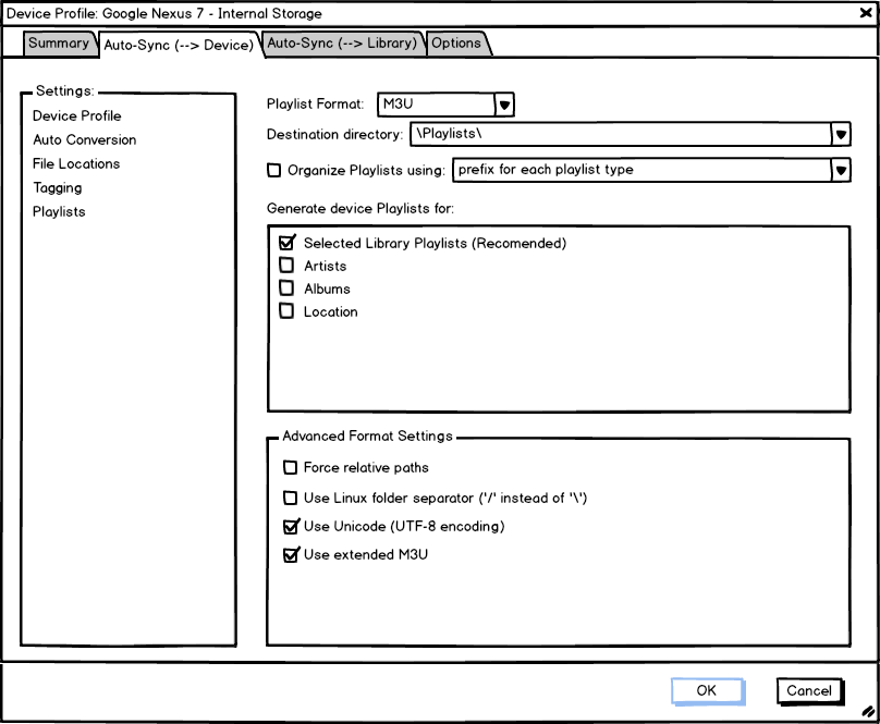 | Description | As talked in 0010746 and 0010757 Playlist Sync settings are confusing and not easy as they should. Per Ludek proposal here are UI changes that would need to be made in order to simplify control of playlist sync and settings, but retain compatibility and functionality with current Device profiles without introducing risk of regressions. These changes involve: 1. "Auto-Sync (--> Device)" -> Playlist Selection -> Sync Playlists. Where we moved actual playlist sync control After 0010746 is fixed 2. "Options" -> Playlists. Which will not be Grayed anymore and edit will be available always. Changes involves: a) Selecting what Playlist format will be synched to device b) Rearranging of options c) Change Additional playlists sync from classical CheckBoxes to TreeView so that if we decide and theer is additional requests for it we can add additional Playlists more easily (eg. Album Artists, Directors, Date, Genre, ...) or even make this configurable by adding all MMW columns to possible playlist creation d) Introducing Advanced Format Settings that will be Show/Hidden/Grayed/Filled according to Selected Playlist format | ||||