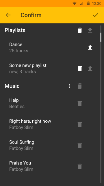 c) yes, each group (Music, Playlists, ...) has the same icons as particular items and user can select the action for whole group at once. The example screenshots shows the situation where deletion is checked for all playlists that need confirmation for deletion - 1 playlist called "Some new playlist" Re.Note : yes, it will remain the same as it is currently in 1.2 |
