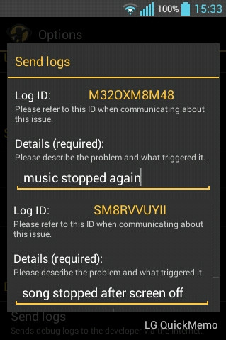 | Description | After Upgrade to 159 MMA Mostly stops playback after screen goes off. Nothing is connected to phone (LG L5 JB 4.1.2 as selected profile). | ||||