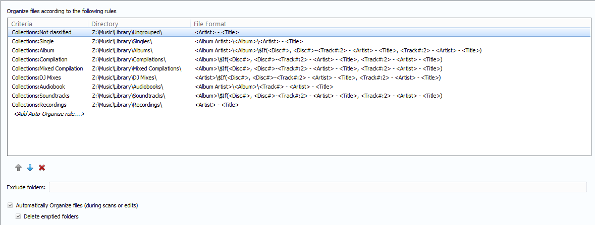 For testing. - Added Auto-Organize rules picture. - Collections are based on Grouping tag - Album - Grouping equals “Album” Single - Grouping equals “Single” or “EP” Compilation - Grouping equals “Compilation” Mixed Compilation - Grouping equals “Mixed Compilation” Soundtrack - Grouping equals “Soundtrack” DJ Mixes - Grouping equals “DJ Mix” Audiobook - Grouping equals “Audiobook” Ungrouped - Grouping is unknown Recordings - Grouping is “Recording” |