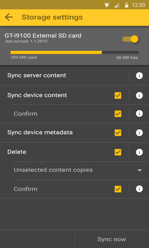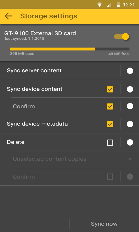 | Description | In MMA 1.0.7, the sync settings dialog doesn't indicate how much space remains on the location, which can result in users trying to sync too much. It just shows: Sync Location/Settings --------------------------------- <Device-storage location> Sync to this location [x] Auto-sync server content ... ... This should be changed to: Sync Location/Settings --------------------------------- <Device-storage location> [Toggle] [xxxxxxxxxx-----------------------------] 2,5 GB free x MB Audio x MB Video last synced: <date> Autosync server content ..... Note: The most important item to display is the amount of space remaining. A graphical indicator and the amount used for Audio / Video is not critical. | ||||