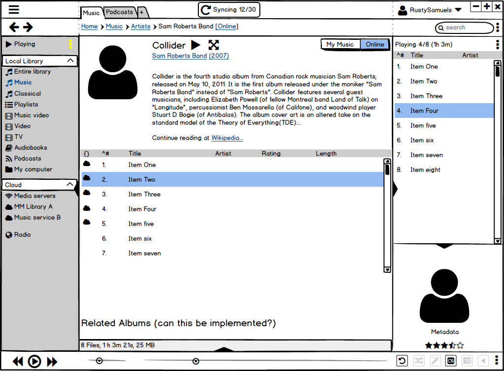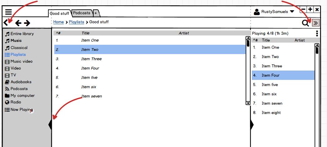 | Description | The current toolbar/titlebar/tab bar arrangement can be improved so that: a) it takes up less space (e.g. the title bar wastes a lot of space) b) icons are arranged so that they're aligned with the portion of the UI that their functionality affects (e.g. tracklist view selector should be near the tracklist). This can be accomplished as follows: i) Combine the title bar with the tab bar (as in MM4). If the user doesn't use tabs, then the tab bar will appear empty as MM5 currently does, with the '+' button hidden in the overflow menu OR the main UI can appear as a tab with a single '+' button next to it (as in Chrome). ii) To better align icons, the UI can be divided into 3 regions as shown in the mockup and that the different icons are aligned as shown (it's similar to the approach taken in gmail on a tablet in landscape mode). Note that when the NP (or the tree) is hidden, the icons that are right justified move to the right, while those that are left-justified move to the left. See the attached images. | ||||