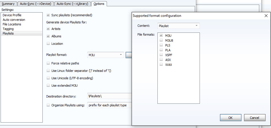 ok, some questions: 1) Are the PLA playlists visible by the device and browseable/playable OK ? 2) How Windows Media Player sync the playlists? As M3U or PLA ? 3) Because the device doesn't report M3U as supported then you need to set it manually, go to Device -> Options -> Playlists -> click the [Set formats...] button and check M3U checkbox, select M3U in the 'Playlist format' dropdown and click [Apply] button !! Maybe you did not click the [Apply] ? Re your workaround: this should be default for the M3U settings: [ ] Force relative path -- disabled, so that it is like '/Music/..' and not '../Music/' [ ] Use extended M3U -- disabled, so that EXTM3U lines are missing 4) In the ticket IMG-416-78728 there is only log from 10th on March (DESKTOP-9OUE1MS.LOG) generated by the user where only PLA playlist was synced. So please upload debug log when syncing the playlist as M3U (according to settings in item 3). |