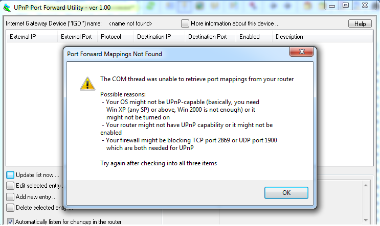 However, when I test with UPnP Port Mapper, although it successfully retrieves port mappings, it can't save them due to an error related to failure to detect the routers _internal_ address.