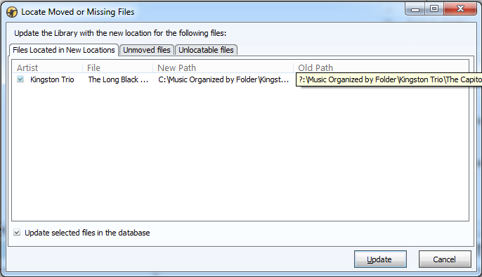 Both drives exist but music folder is copied to second disk after Step 2 and original folder "Music" "1music" so that MMW generate grayed tracks and allow locate moved missing to find files on new drive. Which is successful for all tracks except those 4. DB contain three locations C drive, one drive with only 4 tracks that can't be located (physical drive is present but tracks are not in the DB path step 3) and third drive with all other files including those 4. You should extract DB and try to locate sample track. After it fails we need to determine why as that track is one from original drive and playable/recognized if pathname is restored (Reverted rename from step3) and what makes MMW fail to locate it and/or why rescan Step2 do not update DB so it can be located afterwards in step4 but listed in non locatable files. |