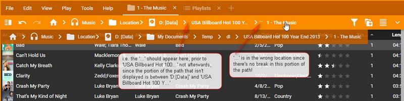 I didn't test breadcrumbs in all views, but noticed that in the Music > Locations view that '...' appears often at the beginning of a directory name even when the directory isn't being truncated. e.g. Music > Location > D: > My Documents > Temp > ... dl > In this case no directories are hidden or truncated, yet '...' still appears. Note, however, that it doesn't always appear; it appears when navigating deeper into the directory structure, but not when navigating back up. Music > Location > ... dl > ... Queens of the stone age > In this case, several directories are truncated (between /Location and /dl), so it should be listed as Music > Location > ... > dl (i.e. note the additional '>') and Queens of the stone age isn't truncated, so it shouldn't be prefaced with ... i.e. it should appear as Music > Location > ... > dl > Queens of the stone age > |