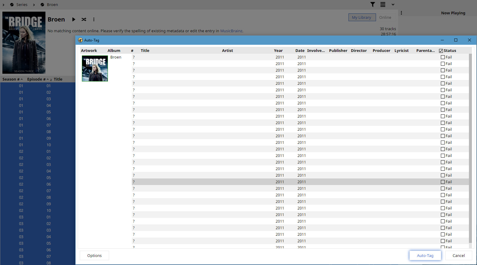 | Description | TV Series Auto Tag still fail for some TV series "The Bridge (2011)" https://www.thetvdb.com/?tab=series&id=252019 is falsely recognized as "The Bridge" https://www.thetvdb.com/?tab=series&id=140151 Folder/path/filename structure and series info uploaded to FTP. | ||||