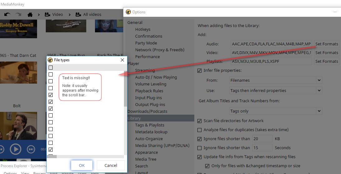 | Description | When the user clicks Options > Library > Add: ['Set Formats'] the resultant 'File Types' dialog is missing text. | ||||
