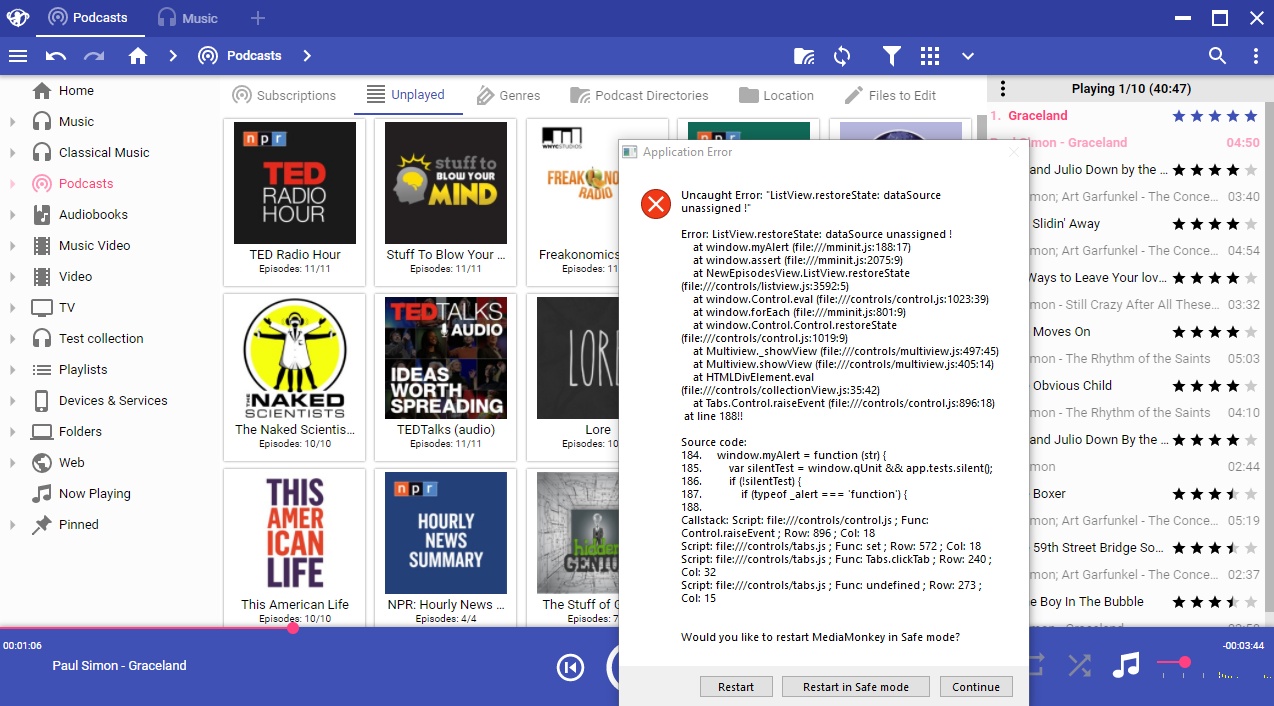 DescriptionSwitching to Podcasts view and then clicking the different tabs triggers ""ListView.restoreState: dataSource unassigned !"" when the 'Unplayed' tab is clicked.