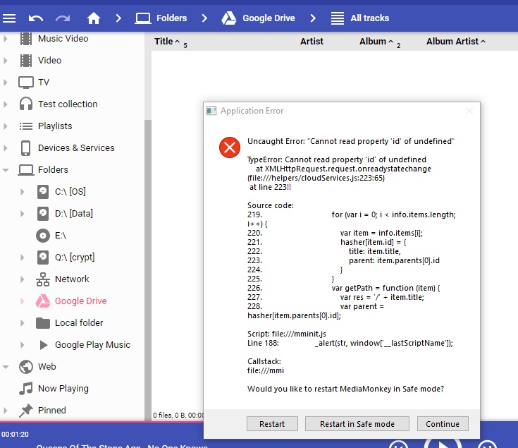 | Description | In testing #13571, I: 1 Deleted media content (/MediaMonkey, /Music, /Playlists directories) from Google Drive (using the Chrome Browser) 2 Selected an Album in MM5 and used Send To > Google Drive --> Content appeared to sync successfully to Google Drive (even though it didn't actually copy--see first note below) 3 In MM5, navigated to Folders > Google Drive --> Uncaught error: "Cannot read property 'id' of undefined" | ||||