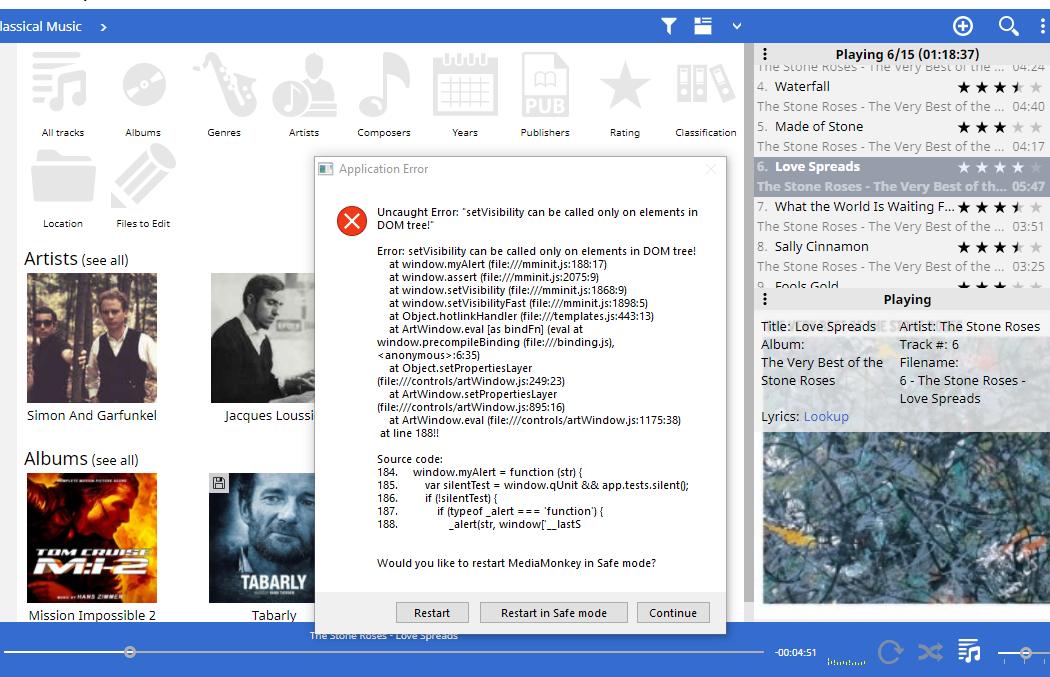 I wasn't able to replicate that exact problem, but maybe this attached image and associated log give a hint? This was triggered by switching between Selected and Playing in A&D dialog, with nothing selected. e.g. 1 play tracks 2 click Home node (so that nothing is selected) 3 click play/selected toggle |