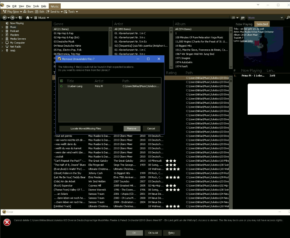 I cannot confirm that the tag was not written as rrom the debug log (attached to ticket YMQ-736-56282) I see: 00002268 72.79450226 [11460] MP3: Going to write tag to C:\Users\Niklas\Music\Jukebox\01 Hip-Hop & Rap\Antilopen Gang\2015 Abwasser\04 - Antilopen Gang - Abwasser - Lügenpresse 1 (Skit).mp3 00002269 72.79452515 [11460] MP3: Writing ID3v2 00002270 72.81676483 [11460] MP3: Updated ID3v2 00002271 72.81683350 [11460] MP3: Writing ID3v1 00002272 72.81796265 [11460] MP3: Updated ID3v1 00002273 72.81809235 [11460] 22460 DB exec SQL: UPDATE Songs SET FileLength=1968256, TrackModified=43437.368654803,FileModified=43437.368654803 WHERE ID=9563 00002274 72.81813049 [11460] 22460 DB lock successful. 00002275 72.81835175 [11460] 22460 DB lock finished, took 497. 00002276 72.81864929 [11460] RestoreFromTagging starting. 00002277 72.81868744 [11460] RestoreFromTagging finished. 00002278 72.81873322 [11460] Tagging: Track was tagged: C:\Users\Niklas\Music\Jukebox\01 Hip-Hop & Rap\Antilopen Gang\2015 Abwasser\04 - Antilopen Gang - Abwasser - Lügenpresse 1 (Skit).mp3 So it looks like if the track was successfully tagged. Michal, is it possible that it is false positive? Could you please verify that if a track fails to update the tag that the error is seen in the debug log? Otherwise whenever MM is unable to save the tag then we could possibly show the error log that auto-disappears in 10 seconds so that user is aware of that, but probably a "dont show this again" option is needed. To be reviewed by Rusty at first... |