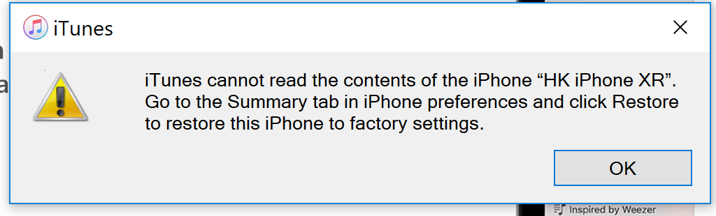 | Description | After MMW sync to users iPhone even all looks OK on iPhone when starting iTunes it reports a corrupted device and suggest Factory Reset. iPhone XR, iOS 12.1.2 (claiming that it also happened with 12.1.1) Logs and related info in Ticket | ||||