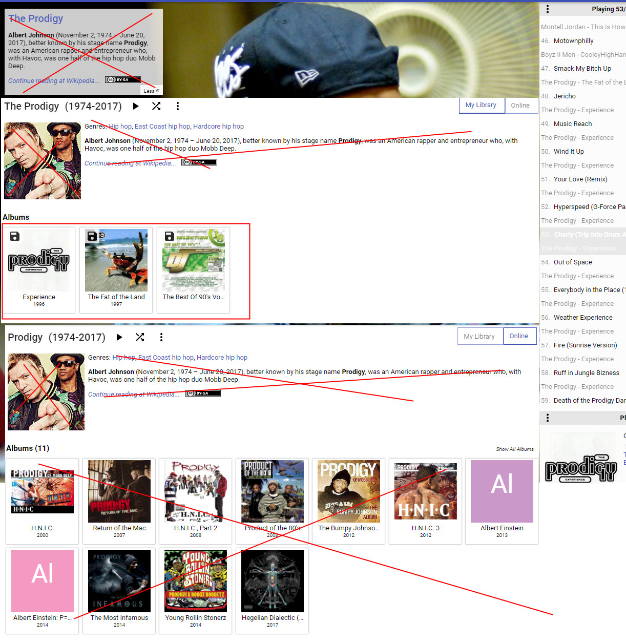 Corrected I was referring to Artist Bio Search or Using Find More from same Artist For group "The Prodigy" result is https://en.wikipedia.org/wiki/Prodigy_(rapper) which Wikipedia itself tells "Not to be confused with The Prodigy" https://en.wikipedia.org/wiki/The_Prodigy |