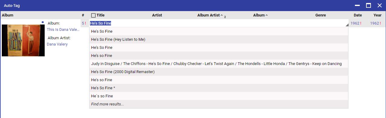 22) He's so fine - The Chiffons: If all metadata except for the title is deleted, and auto-tag is run, then it suggests a version of the track by Dana Valery. I'm not sure why. Moreover, as with case 21) there are multiple identical titles (see attached)?! |