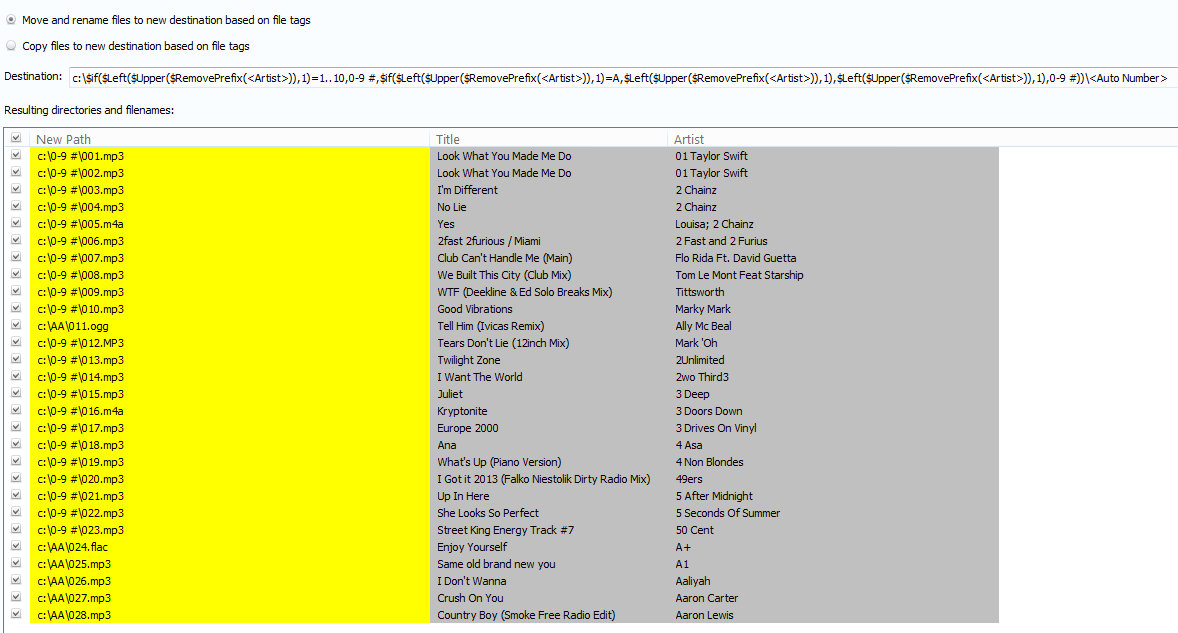 Look that you are right althrum this one works it is too nested like you pointed: Mask like "c:\$if($Left($Upper($RemovePrefix(<Artist>)),1)=1..10,0-9 #,$if($Left($Upper($RemovePrefix(<Artist>)),1)=A,$Left($Upper($RemovePrefix(<Artist>)),1),$Left($Upper($RemovePrefix(<Artist>)),1),0-9 #))\<Auto Number>" We should support (..) for Numeric Values and A..Z for ASCII Latin Charset. |