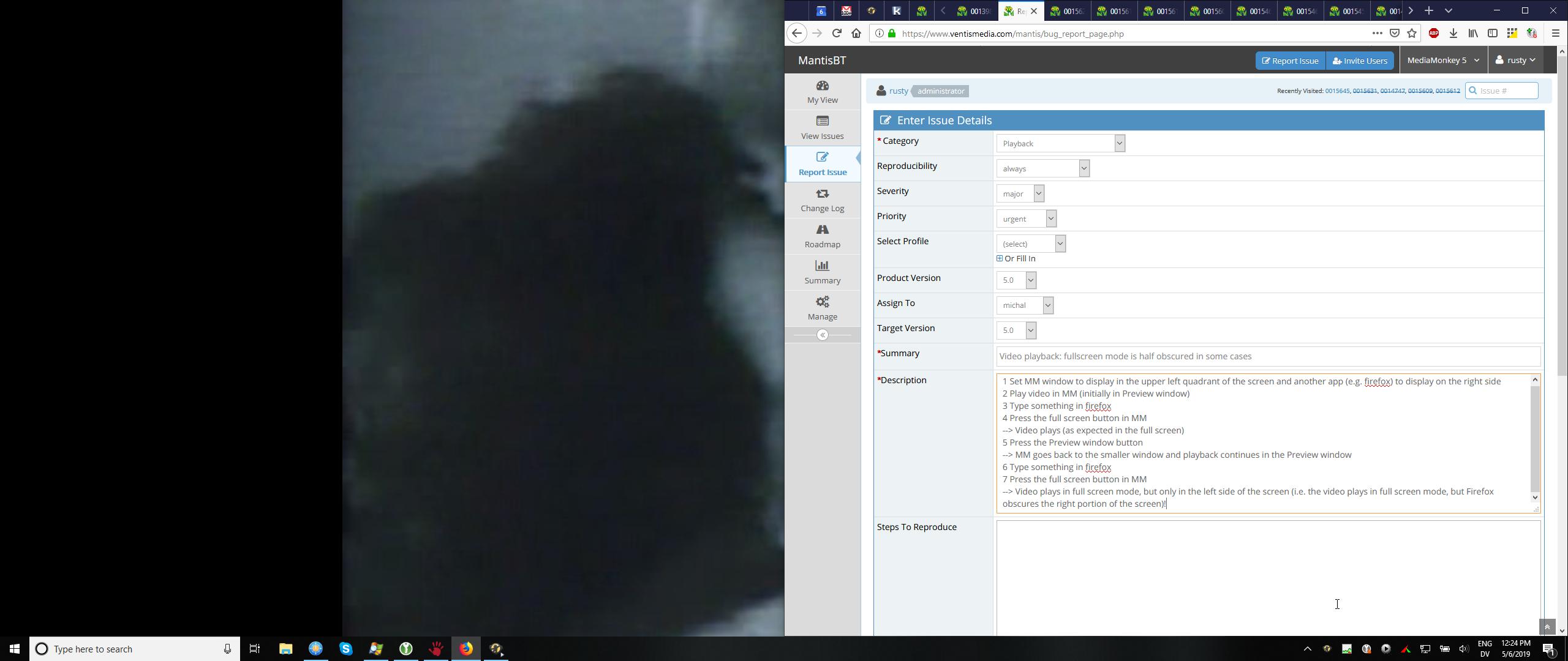 | Description | 1 Set MM window to display in the upper left quadrant of the screen and another app (e.g. firefox) to display on the right side 2 Play video in MM (initially in Preview window) 3 Type something in firefox 4 Press the full screen button in MM --> Video plays (as expected in the full screen) 5 Press the Preview window button --> MM goes back to the smaller window and playback continues in the Preview window 6 Type something in firefox 7 Press the full screen button in MM --> Video plays in full screen mode, but only in the left side of the screen (i.e. the video plays in full screen mode, but Firefox obscures the right portion of the screen)! | ||||