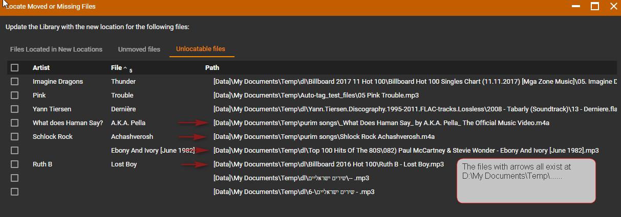 With the custom .exe, when I selected all files in [Data]\My Documents\Temp and attempted to find them in D:\My Documents\Temp, 4 of the unlocatable filse weren't found even though they do exist in the searched location (verified manually in Explorer). What's interesting is that the files that couldn't be found were different than previously?! |