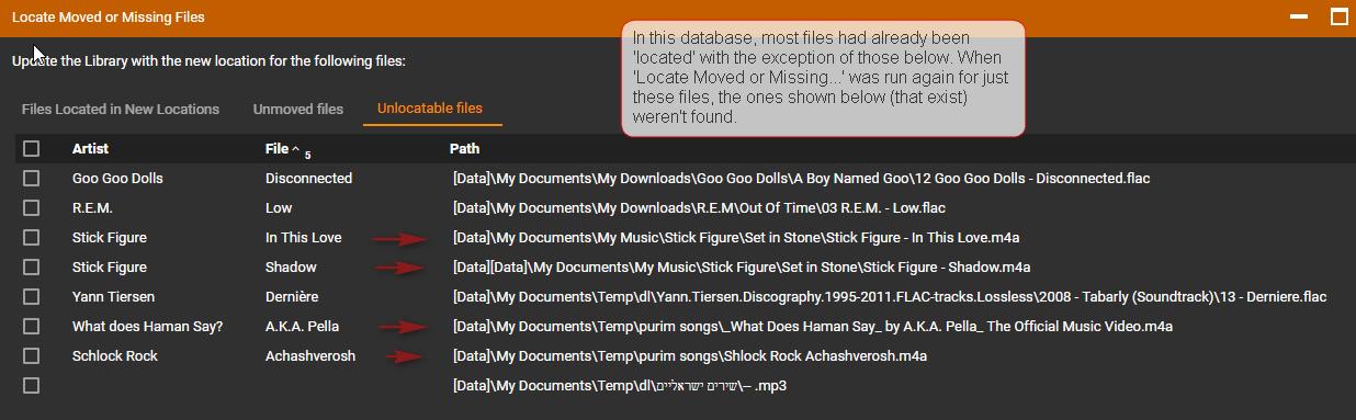 | Description | I'm not sure why this is the case, but for certain files, the Find Moved/Missing functionality fails to find the moved tracks (even though other tracks are found, and even though the missing tracks exist in substantially the same location on the drive. See in the attached log, many tracks are found in new locations, but the following ones aren't even though some of them do exist. Of the ones that weren't found, the two by Stick Figure should have been found: Disconnected by the Goo Goo Dolls (doesn't exist - FLAC) Low by R.E.M (doesn't exist - FLAC) Achashverosh by Schlock Rock (doesn't exist - moved to a completely different path) In This Love by Stick Figure (DOES EXIST!) Shadow by Stick Figure (DOES EXIST!) A.K.A. Pella by What does Haman Say? (doesn't exist - moved to a completely different path) Dernière by Yann Tiersen (doesn't exist - FLAC) Debug log posted to ftp | ||||