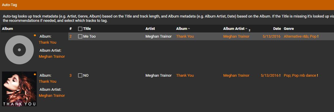 | Description | I'm not sure why, but the track Me Too by Meghan trainor doesn't find artwork (even though other tracks from the same album do). Here's what happens: 1 Auto tag Me Too and No by Meghan Trainor -->Me Too is found on the Album 'Me Too' along with album art -->No is found on the Album 'Thank you' along with album art 2 Change album:'Me Too' to 'Thank you' --> Empty album art appears even though 'No' appears on the same album _with_ album art! | ||||
