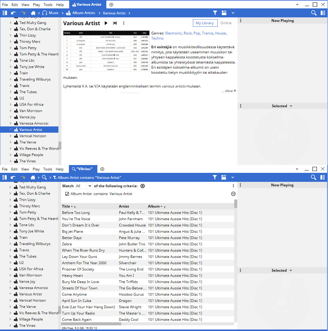 As Worked offline, user database have issues. Test Note: Search results return Album Artist Various 1. Various Tree node is not expandable 2. Selecting "Various Artist" No albums or tracks are shown 3. Rebuild DB and Full text reindex do not fix the view Pic attached |