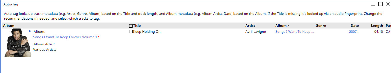 | Description | For Keep Holding On by Avril Lavigne: MM recommends the album 'Songs I want to keep forever Volume I' instead of 'The best damn thing'. Both albums are from 2007, but MusicBrainz in this case has 'Songs I want to keep forever' tagged as an 'album' rather than as a 'compilation', so I guess that's why MediaMonkey recommended it (MM normally recommends Albums preferentially over compilations). If this is the problem, I'd suggest that if an album contains 'various' then MM should treat it as a compilation even if it isn't tagged as such. | ||||