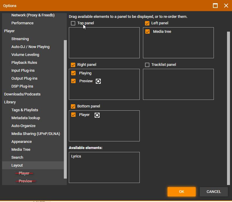 1aii, 1c, 1d, 1e are fixed in 2210 1ai) I am seeing 'Selected v' when playing a file and visualization is enabled, see: https://www.dropbox.com/s/1hux4dg1gxgv1a0/Screenshot%202019-10-31%2011.37.15.png?dl=0 I still don't understand why the header title couldn't be just 'Preview: Selected v' like this: https://www.dropbox.com/s/p244xzjythbc926/Screenshot%202019-10-31%2011.51.40.png?dl=0 This way several requirements are satisfied at the same time: - it is clear what is the "Preview" element - it allows easy toggle between Playing/Selected - in the "Playing" mode it resolves also 0015758 - where it is confusing when two elements are both titled "Playing" 1b) Maybe the "gear" icon in the Options>Layout could be just shortcut to the Options>Layout>Preview ? Or do you prefer eliminating the Options>Layout>Preview panel entirely (to not overfill Options dialog) ? |