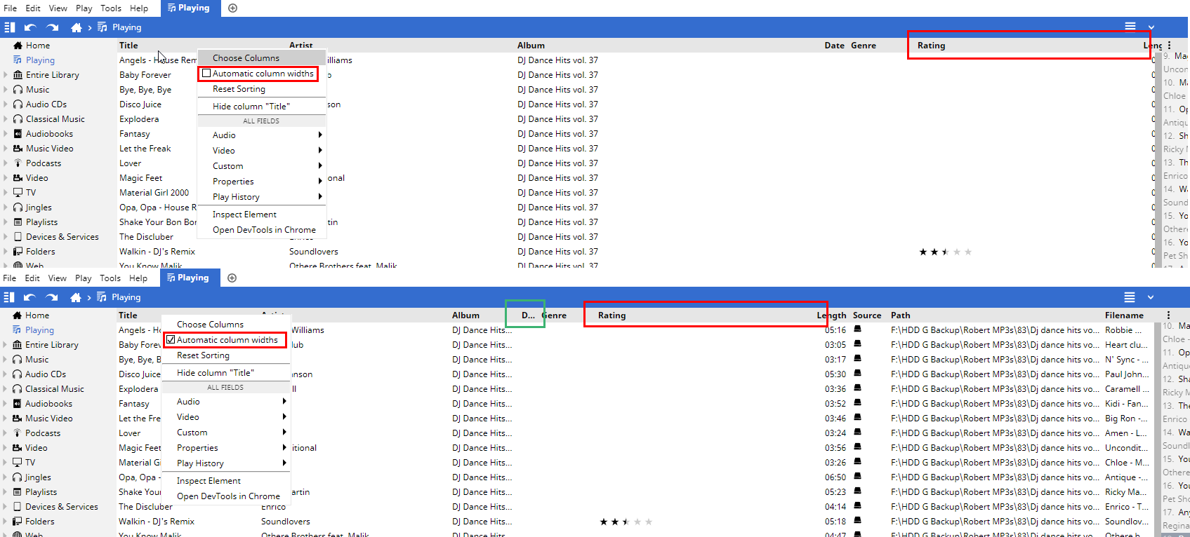 | Steps To Reproduce | 1. Disable Auto Columns Width 2. Expand Rating/Source/Length to be 1/3 of track browser size and Horizontal Scroll is shown. 3. Enable Auto Columns Width 4. Rating/Source/Length is still same size but other columns are truncated without need like Date/Title/Album,... | ||||
