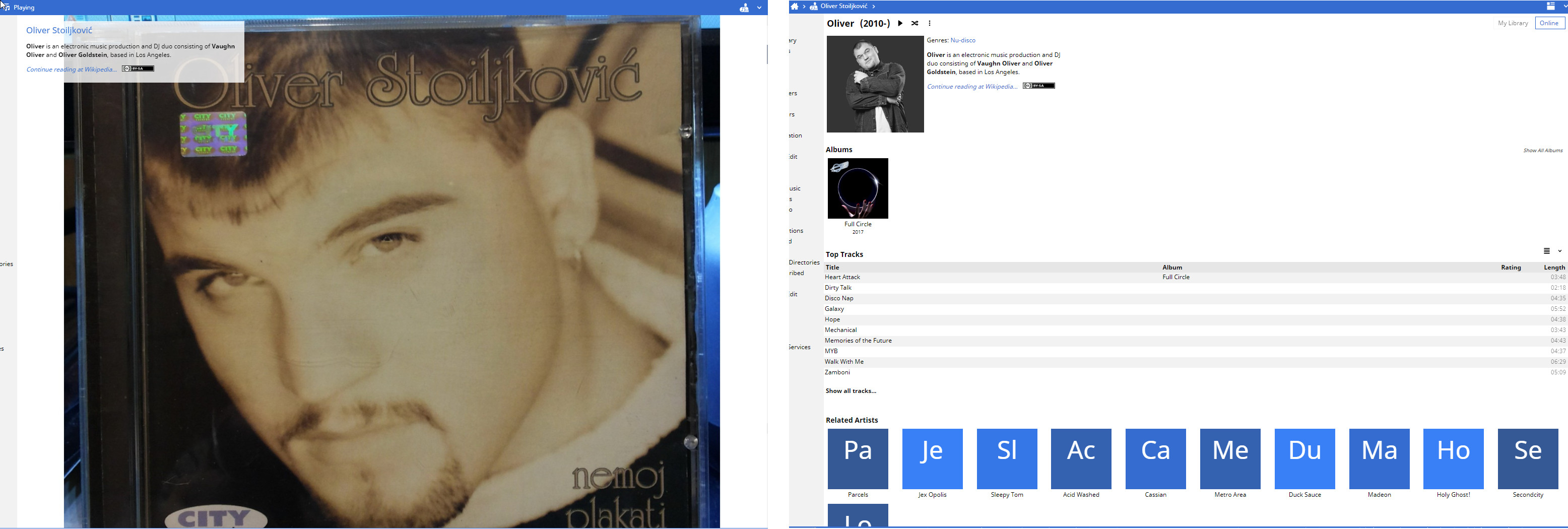 | Description | In case of Foreign Artists bio sometimes completely misses Bio search on WikiPedia and shows completely wrong information. For example Serbian Pop Artist "Oliver Stoiljkovi?" is wrongly presented as "Oliver is an electronic music production and DJ duo consisting of Vaughn Oliver and Oliver Goldstein, based in Los Angeles." which is completely wrong and his profile do not exist on Wikipedia Note: Artist Picture and Playing (Artist Bio) Showing correct images of him and his work. I guess we should lower matching criteria and/or change search criteria. Note: Google Search Correctly finds "Oliver Stoiljkovi?" as Pop artist and discogs also finds correct result https://www.discogs.com/artist/1130680-Oliver-Stojiljkovi%C4%87 | ||||