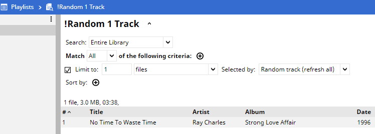 I agree with Ludek on this. Point of this feature is to be able to get Random Full Album no matter of track numbers. As pointed in Description desired behavior is to get Random Full album by artist Queen or any full Jazz Album or even any full album by random if no criteria is used. Example how I do it now even it is not fully random as last selection I need to make. 1. I created Auto Playlist (Pic Attached) 2. Right on track result -> FMFS -> Artist -> Right click on Random Album -> Play Now Ludek am I right? |