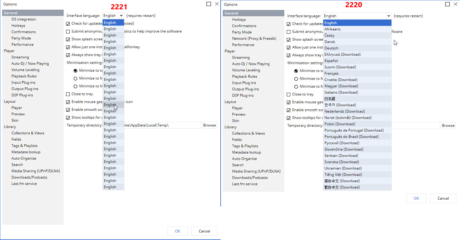 We cannot replicate (tested by me, Michal, Petr). But based on code revision there could be a hidden exception causing this, the exception is probably related to accessing Locale folder. Please temporarily replace your current MediaMonkey.exe from 2221 by this one: https://www.dropbox.com/s/smrcfx8mmexpmal/MediaMonkey.exe?dl=0 and generate one more debug log (using DbgView) for me to see more. |