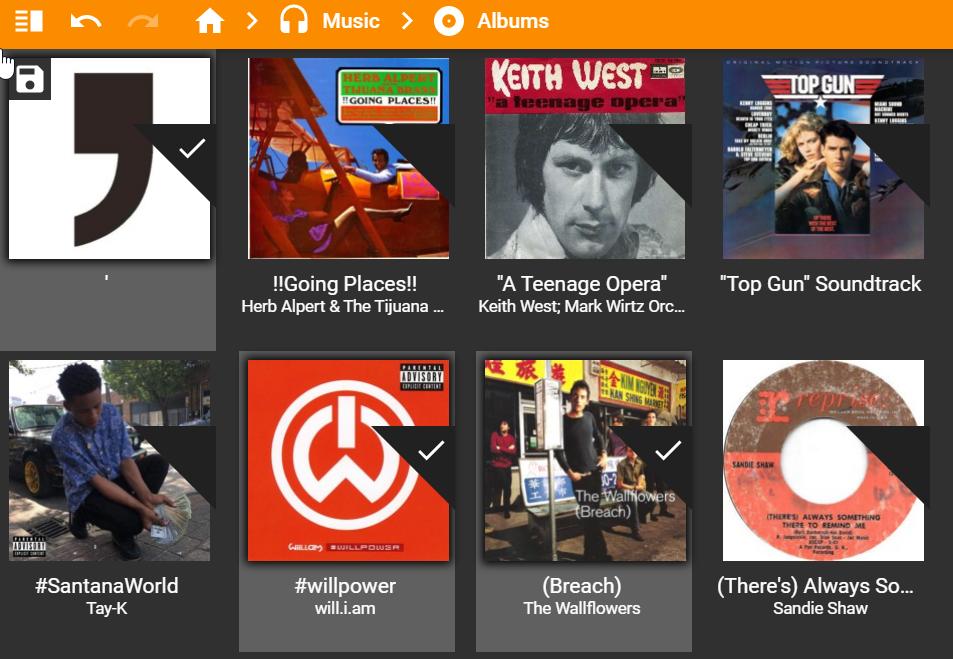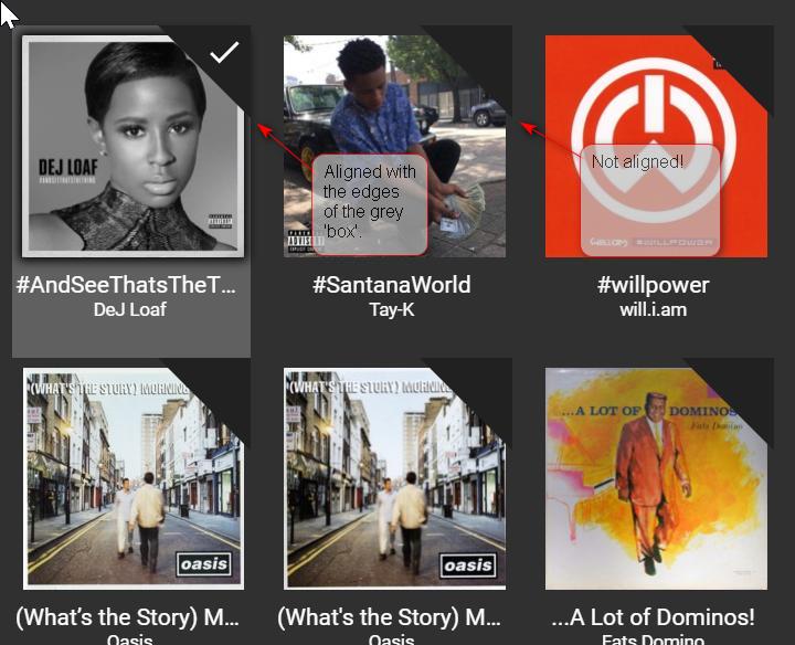 Although the multi-selection checkmarks are now aligned in list views, several alignment issues remain: 2) In list views, the multi-selection check _boxes_ are still misaligned (see the attached image) 3) In grid views, the multi-selection check marks / check boxes don't appear in the corner as expected (see attached) 4) In list views, the Album art appears above the center-line (see attached) Aside: List view checkboxes would look much cleaner if they weren't super-imposed on the text (see attached example). Is this possible? |