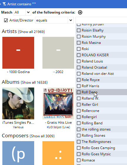 re 5) Typing "Roll" should filter Artists + Starts With (Best would be Contains) + Typing chars (delayed 300-500ms) eg. as seen in attached picture Filtered Artists would be from "Roll Deep" -> "Rollo Goes Mytsic"
