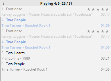 Easier repro steps for 5) 1) play file X 2) choose Play Next on this playing file 3) double-click this just added duplicite of track X |