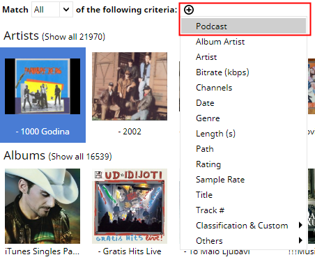| Description | 1. Unlike podcasts where instead of Album we show Podcast and Album is in all UI elements replaced as Podcasts (Including Tree Icons , Search, Properties, ...) Audio Books are handled and Normal Music Albums, We should change that and for Audio Books we should do the same (Including Tree Icons , Search, Properties, ...) Audio Books should be handled more like Podcasts and have similar options/view where there will be clearly shown what was unplayed, downloaded, Audio Books Directories, ... as it will improve user experience. Attached both Audio Books and Podcast browser pictures showing differences. 2. In Advanced Search also do not have criteria AudioBook where Podcast is available. Not sure about other types but Audio Books and Podcasts are specific. | ||||