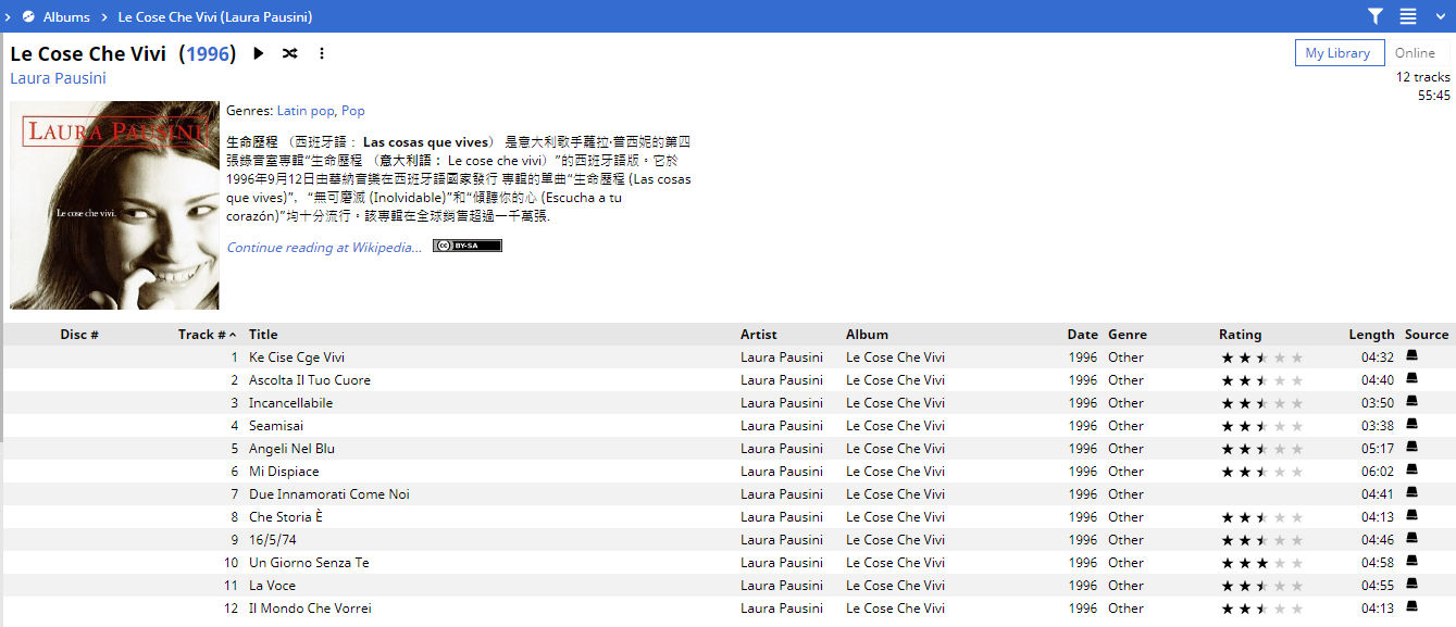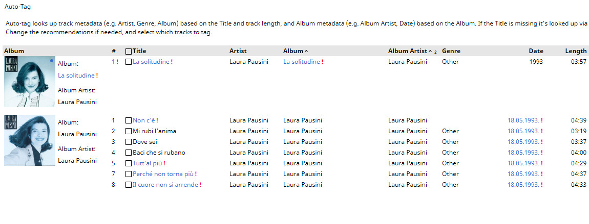| Description | 1. If you try to do an Auto tag on some correctly Albums MM5 tries to tag it incorrectly (bug16597_1_autotagresult.jpg) where track 6 is only one that should be changed (bug16597_1.jpg). Album info at https://en.wikipedia.org/wiki/Laura_Pausini_(1993_album) 2. Some Albums hen seen as album shows completely different info in Chinese (bug16597_2.jpg) and when clicked continue on Wikipedia takes you to Spanish version of album https://es.wikipedia.org/wiki/Las_cosas_que_vives_(%C3%A1lbum) even that search English Wiki by Artist and album name return correct album info https://en.wikipedia.org/wiki/Le_cose_che_vivi . | ||||