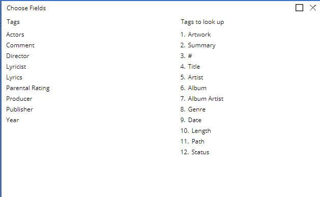 All Classical Music fields are missing, which is why I suggested that Columns viewed are copied from view that initiated Auto-Tag. (I know that they are mapped but column names should reflect view) Also Column view can be automated as pointed in ~58226 as a result of resolving points 2 and 11 from 0016294:0058227 which would act as auto column pre select view columns based on last user view which initiated Auto-Tag. Also it would further make maintain of code easier. |