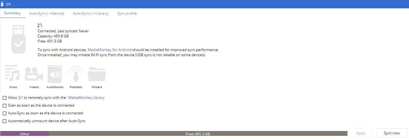| Description | Like Apple sync plugins or Local sync folder that lack some capabilities storage sync profiles should not have all available options like remote sync. Test: 1. Enable SATA Port in BIO as Hot Swapable or use External USB HDD 2. Connect it to MM5 It will be detected as Sync device and enabled 3. Remote sync option exist and there is text about Android devices which is wrong and confusing/misleading to user. | ||||