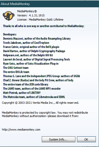| Description | - About dialog scroll message - Splash screen - License - String in the 'About MediaMonkey' dialog --> (Copyright...2003-2021) (Petr) | ||||