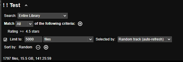 | Description | If an auto-playlist is configured with a limit that is greater than the number of files that match the playlist criteria, then it fails to auto-refresh if the user enables Sort by Random. The bug does not occur if either: - Sort by Random is not configured - The number of matching tracks is greater than the limit For example, supposing the criteria match 973 files and: a) Limit to: 500 files selected by Random track (auto-refresh) | Sort by: Random --> Auto-refresh/F5 triggers a refresh b) Limit to: 1000 files selected by Random track (auto-refresh) | Sort by: Random --> Auto-refresh/F5 fails to trigger a refresh! c) Limit to: 1000 files selected by Random track (auto-refresh) --> Auto-refresh/F5 triggers a refresh | ||||