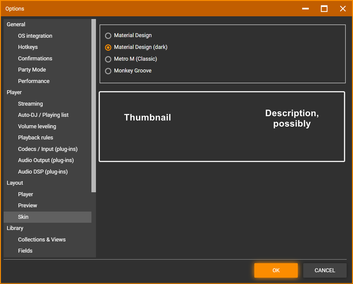Sounds good to me (per the last screenshot above) and I would add also: 1) [Download more skins...] button or link (like used to be in MM4) 2) Probably also configurable font size (like used to be in MM4 and is requested by users) |