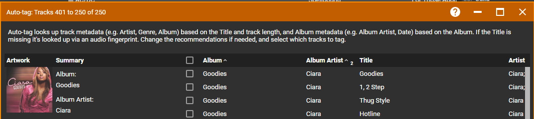 Yes, the counting is still off, 1 Select 250 files --> First was 1-100 (as expected) 2 Select all files to be tagged (no need for Auto-Tag to finish lookup) 3 Tag & Continue --> Second was 201-250, expected 101-200 4 Select all files to be tagged (no need for Auto-Tag to finish lookup) 5 Tag & Continue --> Third was 401-250, expected 201-250 |