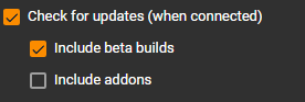 | Description | Enabling Check for updates in Tools -> Options -> General do not include addons. User needs to manually check for updates from addons dialog. 1. We should add Check Box to include Addons just like for beta versions (not sure if we should enable it by default) 2. Toast Message should be added that there is addon updates so that user can easily shortcut to addons dialog | ||||