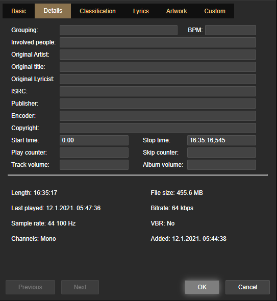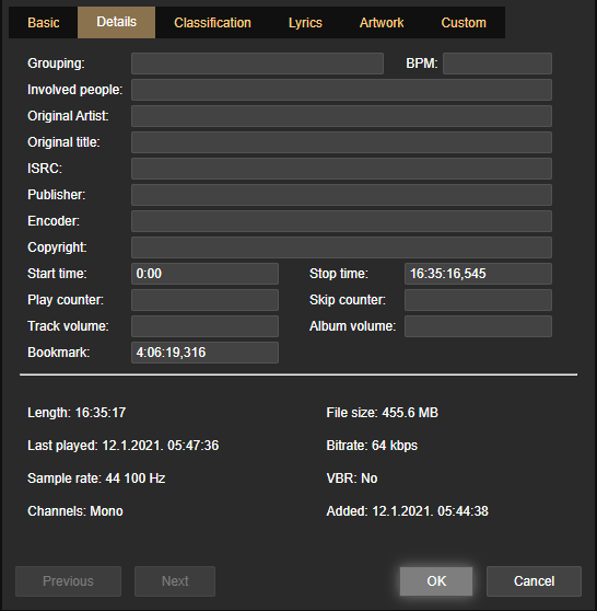 bug 0018182 only refers to player playback behavior for tracks thzt have bookmarking enabled eg. like you pointed in 0018182:0067631 where if track is >10 minutes playback will start from bookmark position if not then it wil start from start. This bug covers functionality that for every played track bookmark value will be filled no matter if track type have bookmark enabled or not, where currently only if track type have bookmarking enable it will save bookmark info in Library. Based on my test adding this do not make any performance issues. eg. For any track type (eg. Music, Audiobooks, Video, Tv Series, ...) if bookmarking is not enabled then Track Properties -> Details do not have Bookmarking info (Pic1), But if you Enable Bookmarking in Playback rules for the type then Bookmarking is shown in details (Pic2). With this bug I want to improve MM behavior so that MM internally in library always write Bookmark information no matter if bookmarking is enabled or not, that way if user Change track type to one that have bookmark enabled or enable bookmark for the type (eg. Playback rules -> Audiobooks -> Enable/Disable bookmark) correct track bookmark value will be available immediately. |