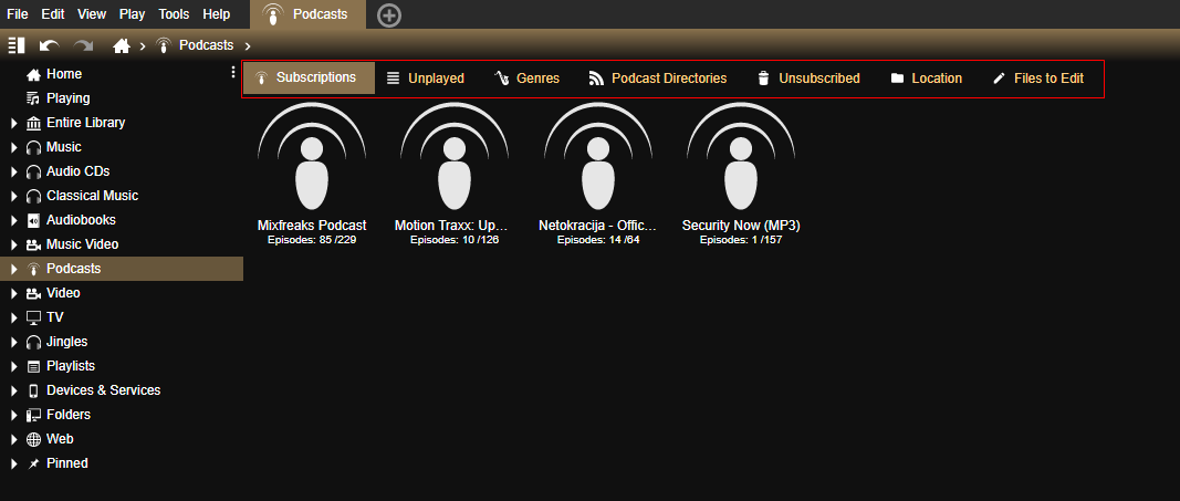 | Description | Users are unable to manage subscriptions if Podcast collection is disabled eg. User can subscribe and update podcasts using EDIT -> PODCASTS but subscribed Podcasts can't be managed. Simplest solution would be to add additional menu options to EDIT -> PODCASTS in order to be same as podcasts collection. a) Solution: ---- Subscriptions (List all Subscribed podcasts) Unplayed (List all downloaded, but unplayed episodes) Unsubscribed (Podcasts that do not have Subscription URL and/or unsubscribed) ---- Subscribe to new podcast Update All Podcasts Export subscribed podcasts... ---- b) Solution: ---- Podcast Subscriptions (List all Subscribed podcasts and show tabs like when you click on Podcasts root collection |Subscriptions |Unplayed |Unsubscribed |Genres |Podcast directories |Unsubscribed |Location |Files to edit |) Subscribe to new podcast Update All Podcasts ---- Export subscribed podcasts... ---- NOTE: I would prefer b) Solution as simplest | ||||