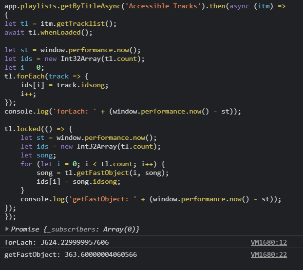 | Description | As discussed offline, the forEach tracklist function appears to create a new object each iteration, instead of internally utilizing the getFastObject function. The speed difference can be demonstrated with the following code: app.playlists.getByTitleAsync('Accessible Tracks').then(async (itm) => { let tl = itm.getTracklist(); await tl.whenLoaded(); let st = window.performance.now(); let ids = new Int32Array(tl.count); let i = 0; tl.forEach(track => { ids[i] = track.idsong; i++; }); console.log('forEach: ' + (window.performance.now() - st)); tl.locked(() => { let st = window.performance.now(); let ids = new Int32Array(tl.count); let song; for (let i = 0; i < tl.count; i++) { song = tl.getFastObject(i, song); ids[i] = song.idsong; } console.log('getFastObject: ' + (window.performance.now() - st)); }); }); | ||||