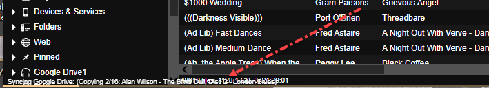 | Description | The Status bar seems to be imbedded into the Player panel. No Status bar if the Player panel is disabled ... Is not enough to just have the Bottom panel enabled. If I move the Player panel to the Top Panel, the status bar moves with it. Acknowledged that the Status bar may be displayed in the spinning wheel's tool tip. But the Status bar has important information in a long running sync operation, and a customer who does not use MM5 as a play client would not know that a Status Bar exists. Tested with with 2516, Code Monkey skin, and sync to Google Drive. Main panel is displaying the LibraryContent tab od D&S>GoogleDrive | ||||