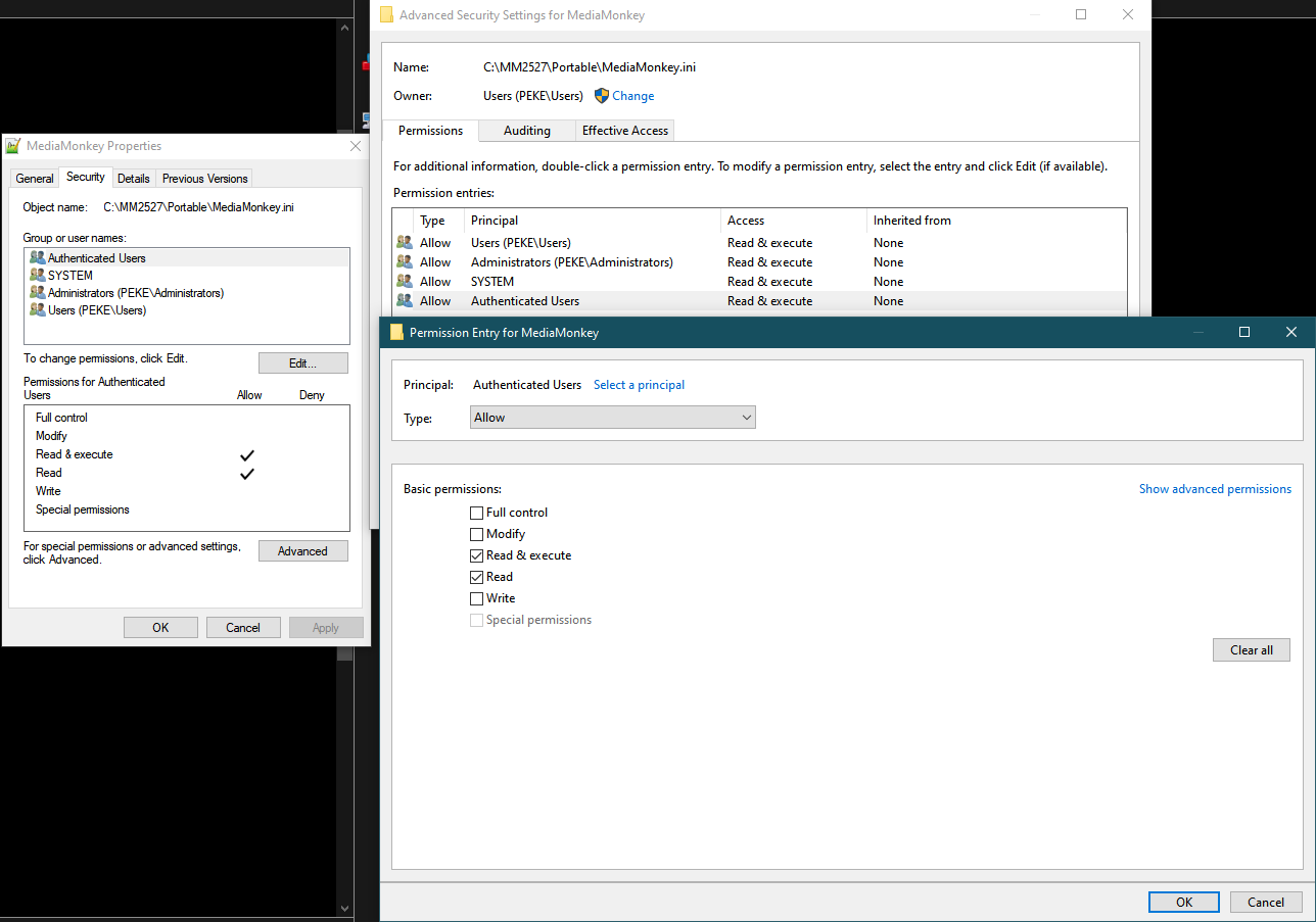 | Steps To Reproduce | 1. Install MM5 As Portable -> Start and Close it 2. Edit Permissions to MediaMonkey.ini (Disable inherited permissions) so that Only Read and Read and Execute rights are allowed for all listed (See attached Picture) 3. Start MM 4. It will start but will constantly show dialog that MediaMonkey.ini can't be created even it is correctly read on start. 5. Closing MM would result in Runtime error 214 and MM.exe processes will not terminate. | ||||