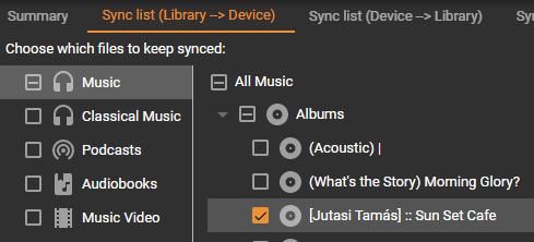What about introducint '[x] Sync all content' checkbox on the right like this: This new checkbox would just mirror state of the '[x] Music' checkbox on the right and would be shown just when [x] Music is checked (in order to make clearer that all collection content is going to by synced) |
