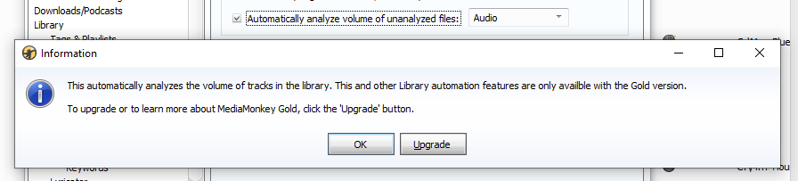 Fixed in 2612 Upon clicking the checkbox the registration dialog is shown. Using these two already existing/translated strings: 'Automatically analyzes volume of tracks as a background process' 'Please upgrade to MediaMonkey Gold for this feature!' |